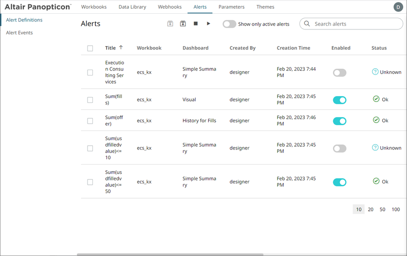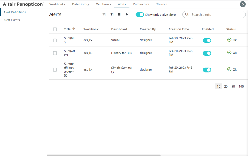 Only the active or enabled alerts are displayed on the Alerts tab.