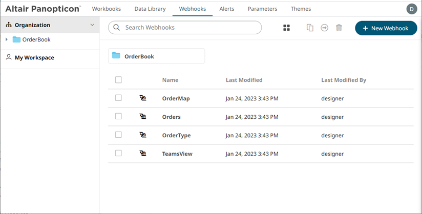 On either display view style, clicking on a webhooks title or thumbnail displays the Webhooks page.