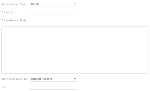 Then enter the following settings: o Token URL – The URL to retrieve the access token from. o Token Request Body – The request body used for access token requests. o Add Access Token To - The Access token retrieved from the Token URL can be added to headers, URL or request body, depending on how the REST endpoint needs the token.