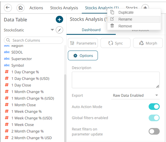 · Right-clicking on the dashboard and selecting Rename on the context menu.