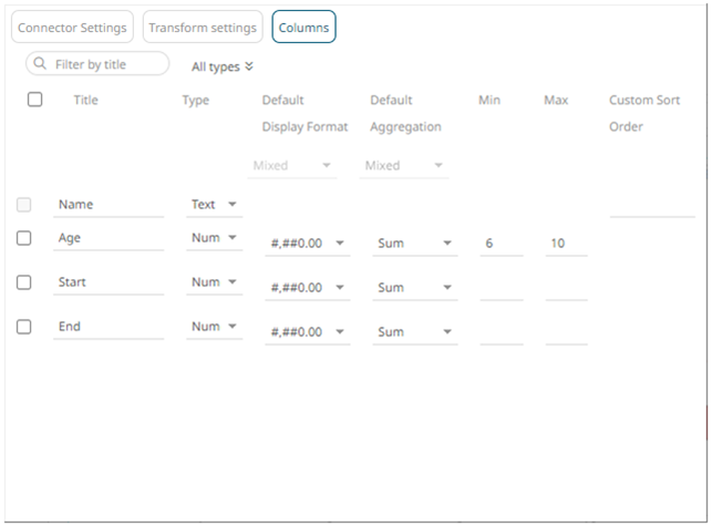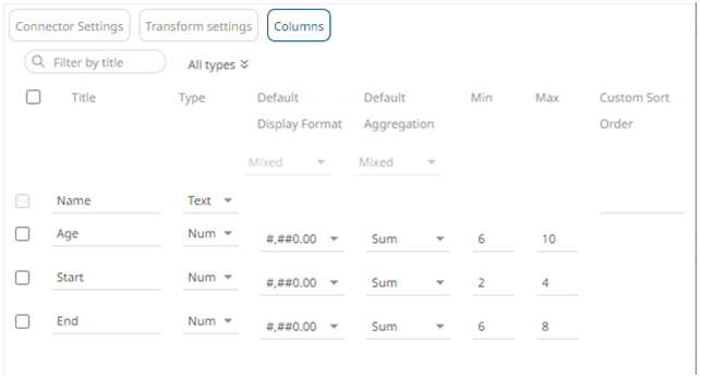 To set the fixed range for several numeric columns, check their corresponding boxes and enter their Min and Max values.