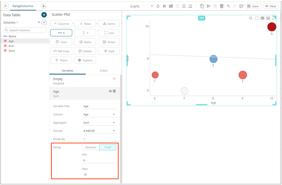 On the visualization, when the Age column is dragged to the X variable, the set Min and Max values are applied.