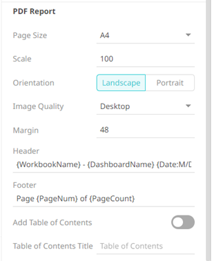 The header to be displayed on the PDF output. Default is: {WorkbookName} - {DashboardName} {Date:M/DD/YYYY} {Time:h:mm:ss A} |