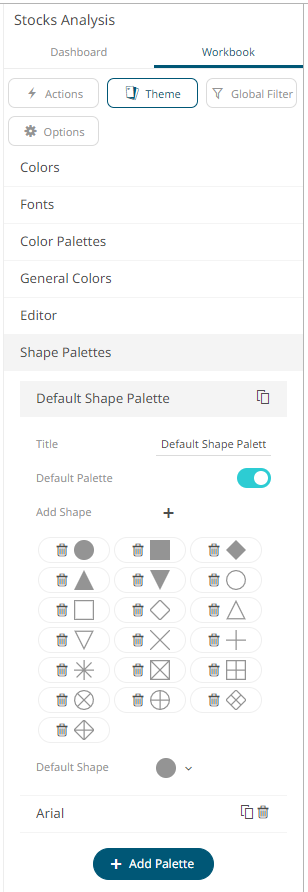 Shape palettes that can be used with the workbook theme can be created, modified, duplicated, or deleted on the Shape Palettes section of the Theme Settings pane.