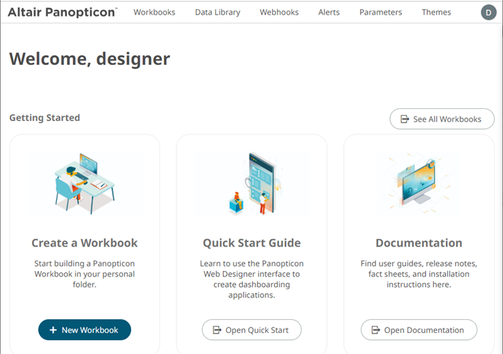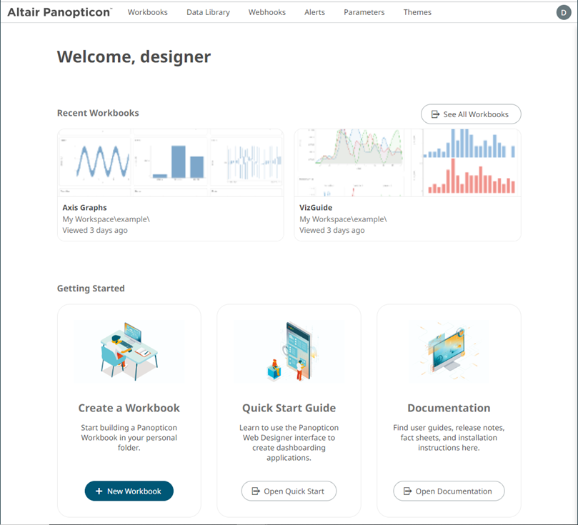 The Welcome page is the first screen that displays when you log on to Panopticon Real Time. This page can also be accessed by clicking the Altair Panopticon logo on the header.