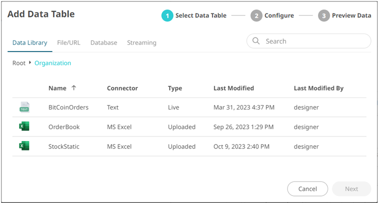 If there are available data tables that were selected in the Data Library page, the Data Library tab will be selected. This option has two steps:1. Select Data Table.