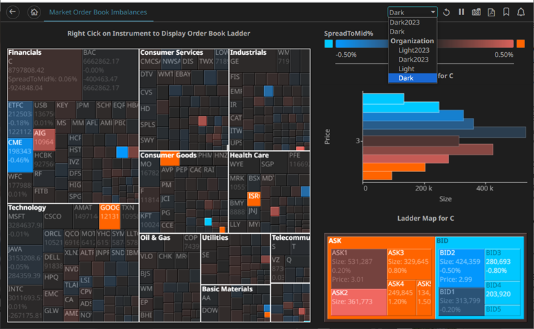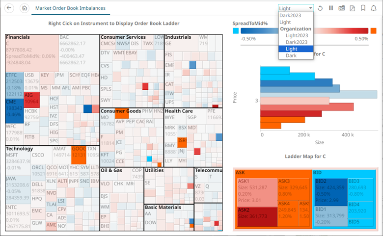 On an opened workbook, users can dynamically switch to one of the provided default workbook themes: Light, Light2023, Dark, or Dark2023.