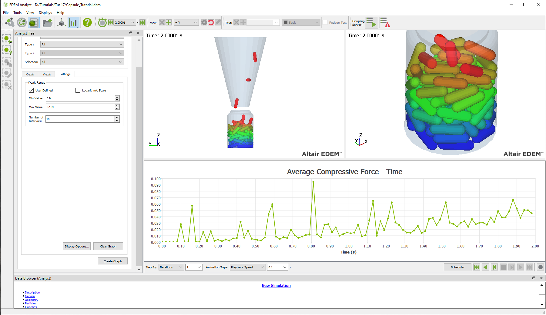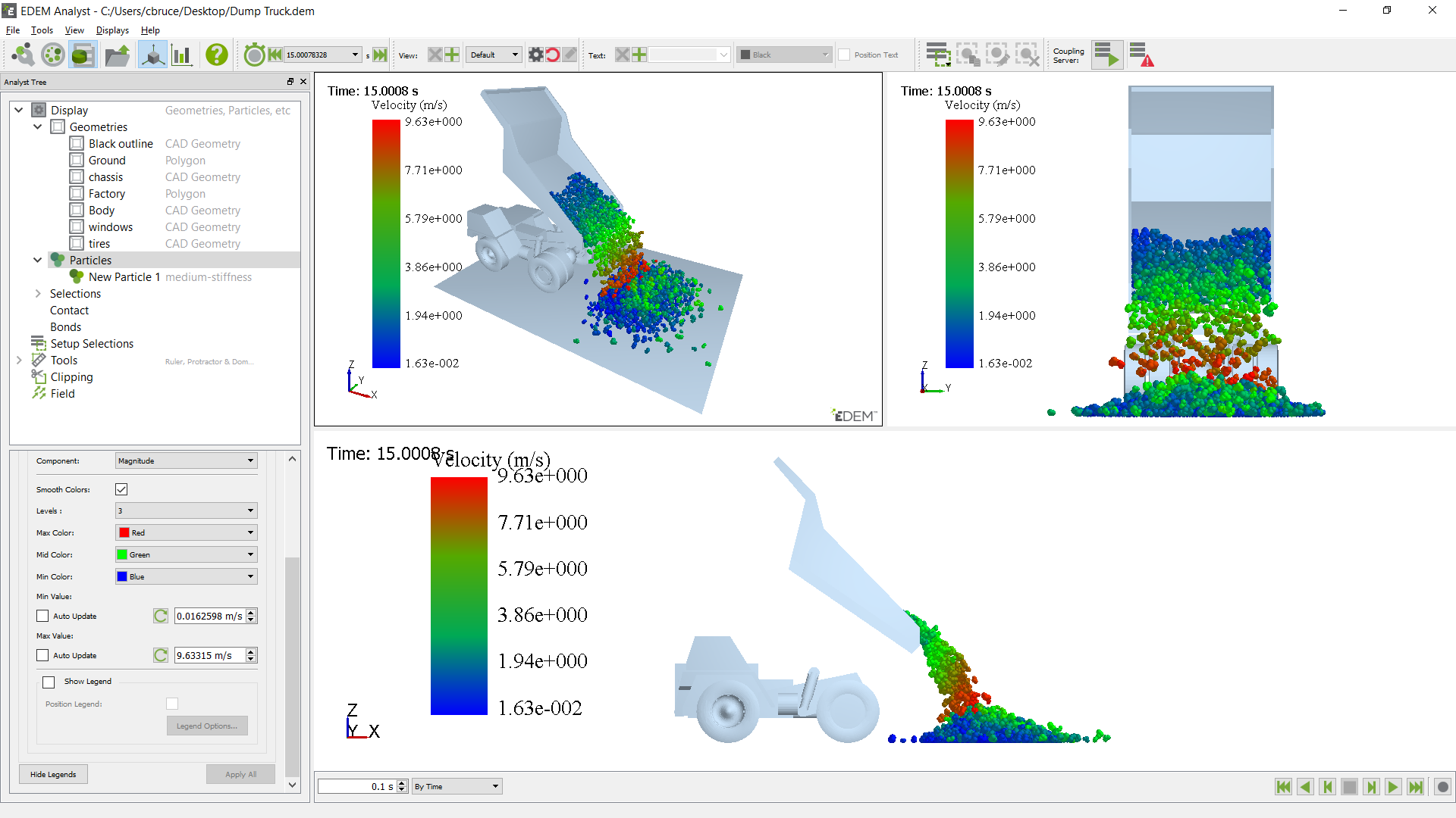The following example shows particles visualized by mass from two view points and a line graph of total compressive force acting on the body of the Dump Truck.