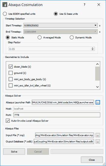 Is displayed when you select Abaqus Coupling in Tools > Options > Coupling Options. The Abaqus Co-Simulation dialog box is used for running Abaqus FEA simulation decks using EDEM contact data as an input. Abaqus Co-Simulation is supported for Abaqus 6.16 and newer.