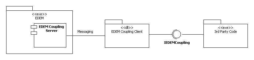 The EDEM Coupling Interface comprises client and server components. The server component resides within EDEM and the client component is to be used by the 3rd party code to interact with EDEM. The EDEM Coupling Client interface class provides users with a number of methods for setup, simulation and data control.