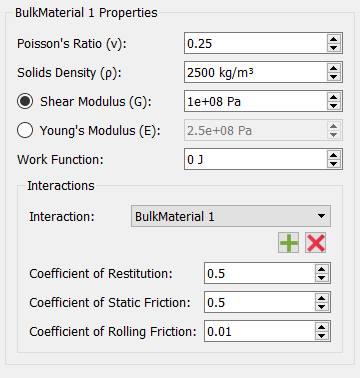 Specify the Poisson's Ratio, Shear Modulus (or Young's Modulus), Solids Density, and Work Function (if applicable).