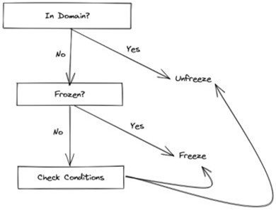 When Dynamic Domain is enabled, particles are frozen or unfrozen at the start of each Time Step according to the following flowchart:
