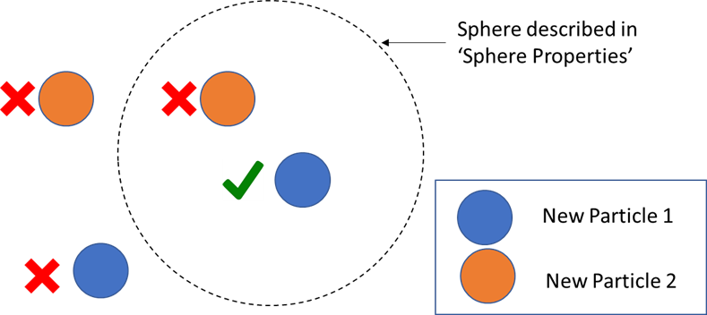 In this example, the particle of type New Particle 1 inside the described sphere is the only particle to meet both criteria. As a result, it is the only particle whose Custom Residence Time value will be increased.