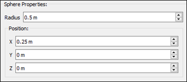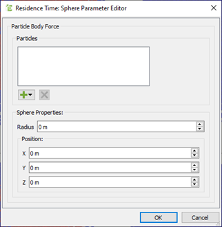 The parameters displayed in the dialog box will depend on the plug-in being used. In this example, the Residence Time in Sphere plug-in is used, but the corresponding Box and Cylinder plug-ins look similar, only with different geometry properties.