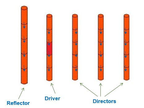 Consider the Yagi-Uda antenna shown in Figure 5. Only the current-carrying parts of the antenna are shown. More specifically, the antenna is represented as an assembly of subdivided sections where each section (or rather, each junction between sections) carries a small but uniform current.