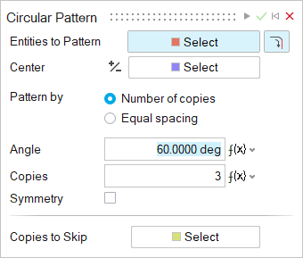 In the guide panel, enter an Angle. Change the number of copies In the guide panel, enter the number of Copies. Pattern symmetrically about the selected center Turn on Symmetry. - Optional: