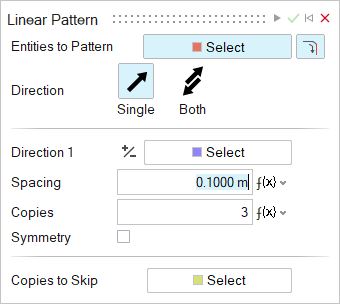 To Do this Change the distance between two copies In the microdialog, enter the Spacing. Change the number of copies In the guide panel, enter the number of Copies. Pattern symmetrically along direction 1 or 2 In the guide panel, for Direction 1 or 2, turn on Symmetry. - Optional: