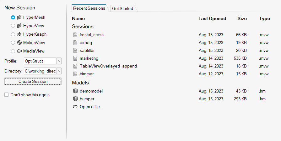Open a Recent Session The Recent Sessions tab lists the recently opened HyperMesh model (.hm), session (.mvw), and MotionView model (.mdl) files. Pick a file to open the session directly and set the client and profile associated with that file. - Optional: