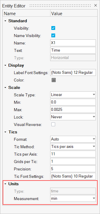 When you select Edit from the context sensitive menu, the application automatically selects the current axis unit of measure. For instance, if the horizontal axis unit of measure is time, time will be selected when the is displayed. If the application cannot detect the current axis unit of measure, it automatically defaults to time.