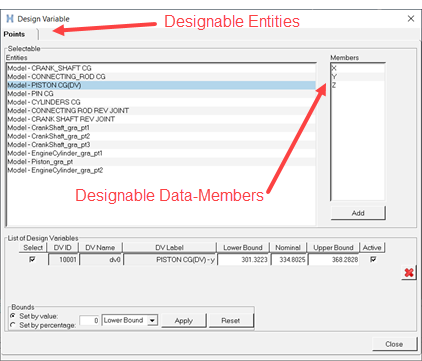 Allows you to declare entity data-members as designable. These design variables could be used to perform an optimization using MotionSolve via the Optimization Wizard, or as parameters for a MotionSolve FMU generated from the MotionView model (designable FMU). See the MotionSolve Models as a Functional Mockup Unit (FMU) topic for additional information. Currently supported entities are: Points, Bodies (Rigid and Point Mass), Springs, Bushings, Forces, and Datasets. Depending on the type of entity that is chosen (before invoking the context menu), the Design Variable dialog box (as shown below) will list various tabs filtering each type of entity. To add a design variable using an existing point in the model, select the