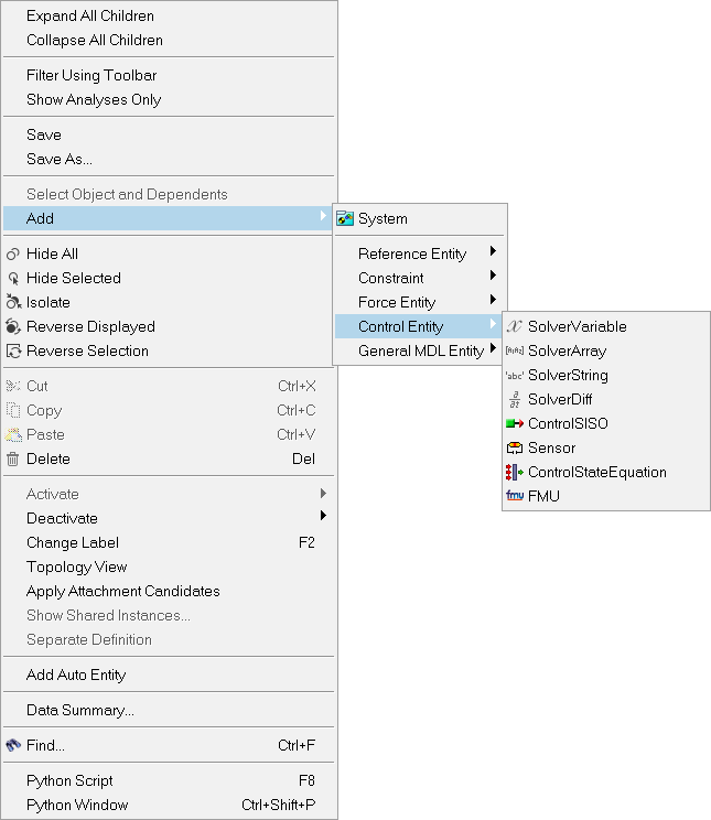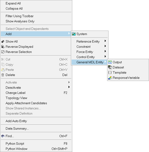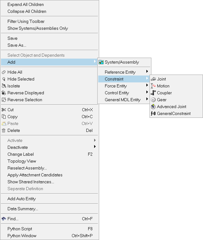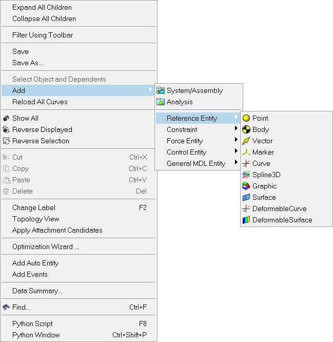 model, system, assembly, or analysis. Sub-menus residing below the top level Add menu, include the following: |