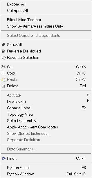 The visibility of browser context menu items is dependent on the current selection. Only menu items belonging to the type of selected items will appear. Options selected in an empty space apply to the entire model. Click on the items below to see the specific context menu options available for each selection: