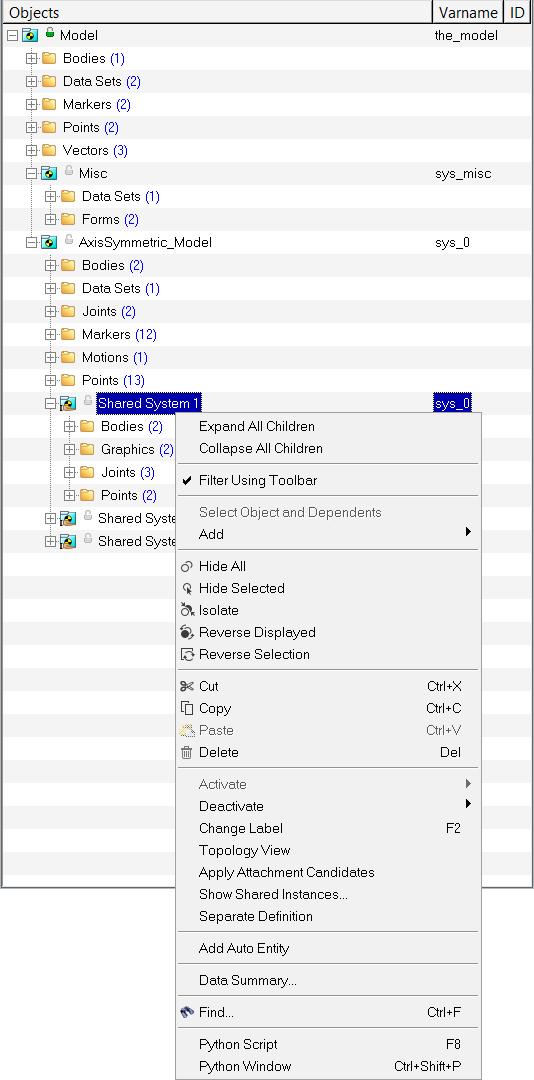 | Isolate | Displays only the selected objects, turning their display state to on, and turning all other entities off. When isolating Joints, SpringDampers, Bushings, Force, and Markers, the bodies associated with such entities are also displayed. | ||