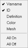 | All On | Enables the visibility of all available column headers (Varname, ID, Definition, Color, or Mesh). | Column heading only. | |
