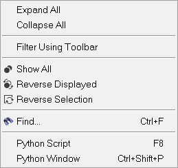 | Python Script | Displays the Python Script dialog. Tip: The F8 keyboard shortcut can also be used to invoke the Python Script