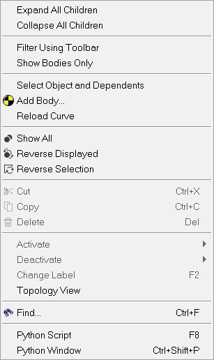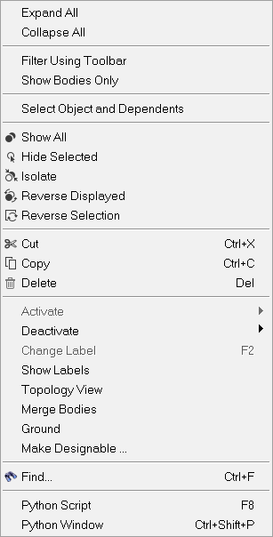 | Activate > Selected and Dependents | Activates the selected deactivated items along with its dependent entities. For example, a deactivated body can be activated along with joints that are defined on the body. | ||
