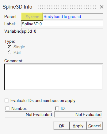 | ID | An integer ID can be assigned to any entity and is used to identify an entity when it is written to a solver-input deck. MotionView automatically assigns an ID to every entity whose ID field is left blank when writing out the solver-input deck. Entity pairs have left and right ID’s so that an ID can be assigned to each entity in the pair. |