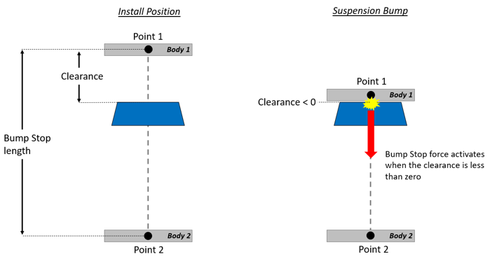 - ClearanceUsing the clearance method, the Bump Stop force is activated when the distance between the Body 1 and Body 2 is less than the Bump Stop Length minus the Clearance value, that is, when the clearance reaches a value lower than zero.