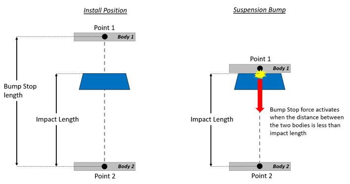 Figure 1. Impact Length methodWhen the distance between the Body 1 and Body 2 is less than the impact length, the Bump Stop force acts. When the Impact Length install method is used, its value is directly used to activate the Bump Stop force between the two bodies.