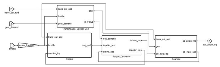 Throttle demand, impeller (reaction) torque and the rotational speed of the gearbox’s output shaft are the inputs to the engine, which is coupled to the transmission through the impeller of a torque converter. The output of the engine block is the rotational speed of the engine’s crankshaft.