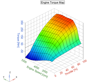 The figure below shows the 2D Torque characteristics of the powertrain based on engine speed and throttle opening values.