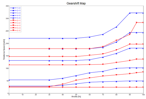 A static gearshift map coupled with dynamic corrections is considered to determine the appropriate gear to drive the vehicle. Gear shifts occur based on static shift lines, as shown in the figure below, and dynamic constraints to eliminate the phenomenon of rapid sequential gear changes in the transmission. The Shift Logic block includes 2D Lookup tables through which shift thresholds and clutch status are calculated according to the gearbox’s output shaft rotational speed and throttle opening.