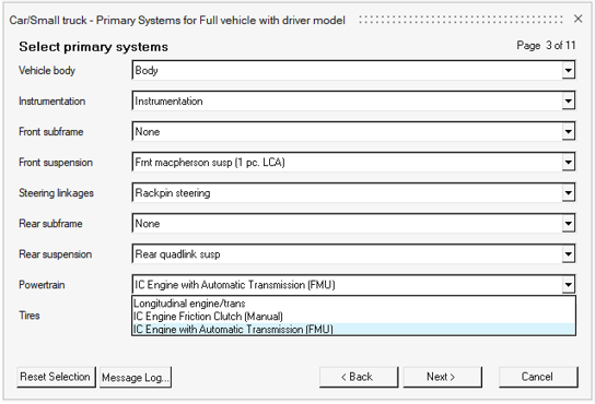 The IC engine with automatic transmission powertrain can be included in MotionView while building a full vehicle with driver model using the Assembly wizard. It is supported in the front, rear, four-wheel drive vehicle configurations. The selection is available under Powertrain option on the “Select Primary System” page, labeled IC Engine with Automatic Transmission (FMU), see the figure below.