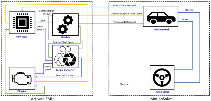 Altair’s MotionView/MotionSolve includes a powertrain model of an IC engine connected to an automatic gearbox through a torque converter. The model is represented by a 1D FMU block including: