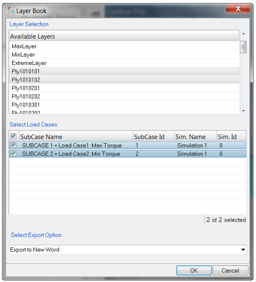 Use the Layer Book tool to contour required results, select layers and load cases, and choose an export option.