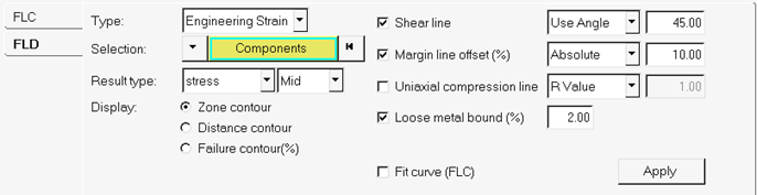 Tip: The 2D window showing the FLD plot displays the chosen FLC curve. If you select a different curve, the plot can be updated to reflect that graph by clicking Apply.