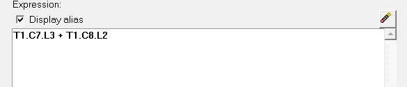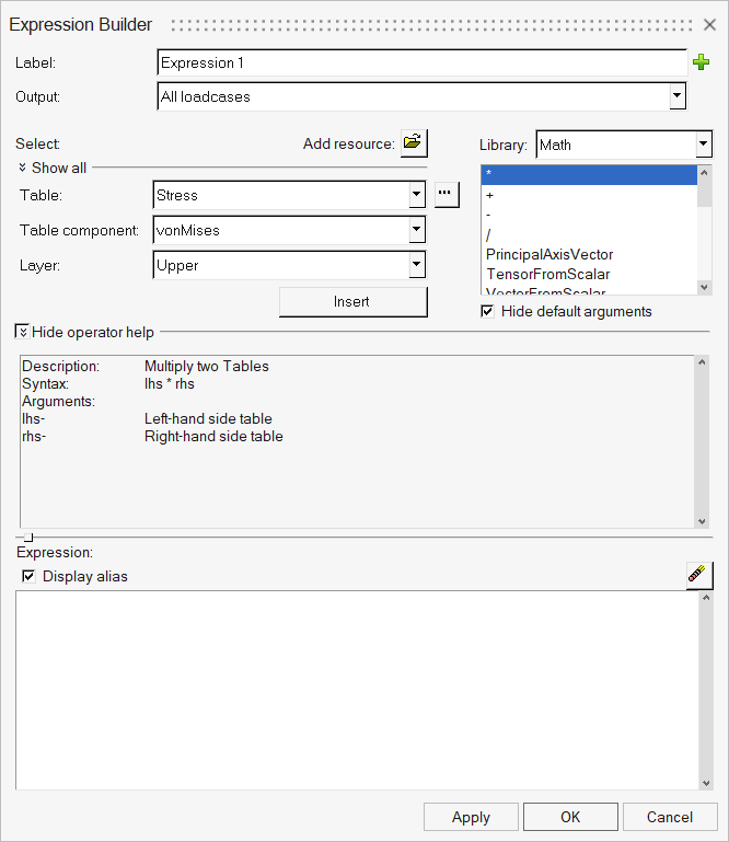 Once a table address is specified, it can be added to the expression (at the current insertion point that corresponds to the argument being defined) by clicking Insert. This will add a table address; however, it will be a short-hand form that allows long expressions to be authored without having to deal with long data type names.