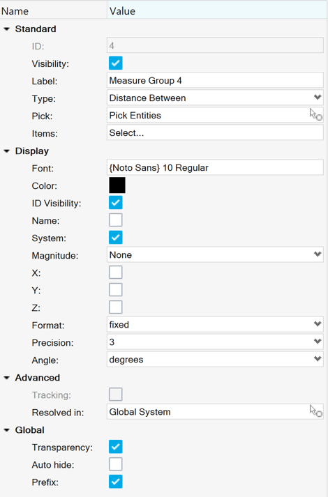 Note: For Minimum Distance measure groups, clicking in the field will display the Minimum Distance dialog. Use the input collectors to select From and To entities.