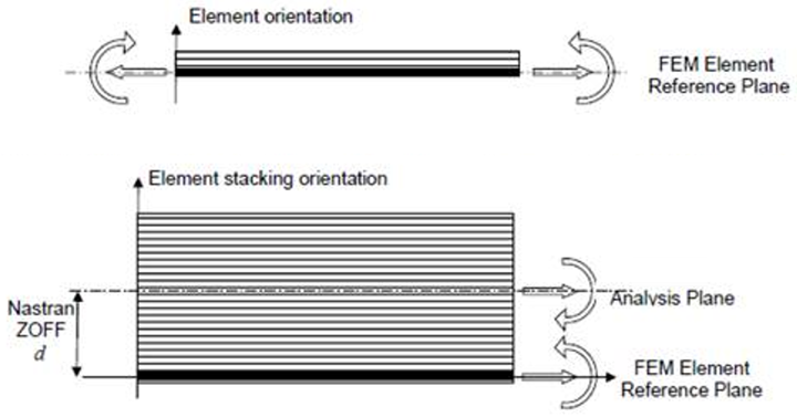 It extracts plate moments at the midplane. Nastran/OptiStruct element force results are given at the element reference plane and the reference plane coincides with the midplane even if element offsets (ZOFFS) are used. However, PCOMP Z0 != -t/2, this is no longer the case and moments must be corrected from the reference plane back to the midplane (Figure 7). This correction is done by the tool prior to producing the output. To consider moment correction if extraction is not performed at the middle surface, the following method is followed: