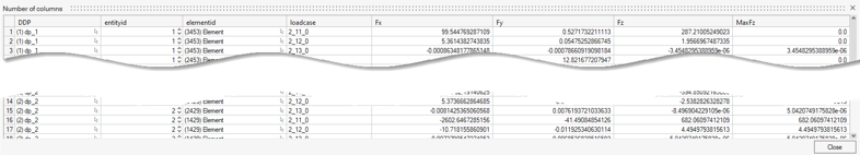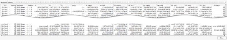 - Output all debug information along with previous results. It includes the point coordinates where extractions happen as well as raw data extracted (Nxx, Nyy, ...) at these locations. It also provides all details of the connection (ID of 1D elements linked to a plate) and box dimension. This results in 85 columns being created. The column remark contains, in the first row, the extraction system being used.
