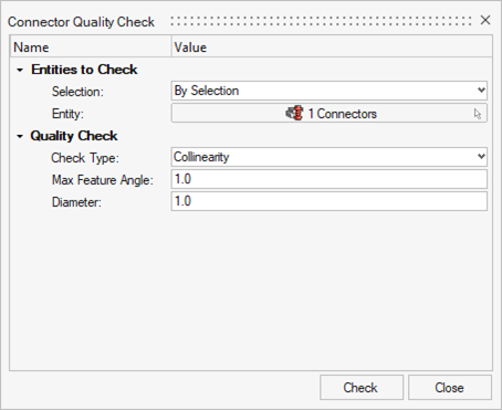 Checks if the links of a connector are parallel to each other, considering the Max Feature Angle. If the first check is satisfied and the Diameter is used, a check is performed to ensure that the parallel area is big enough for a realization with the set diameter.