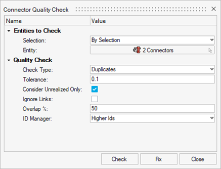 Finds all duplicate connectors (two or more connectors that are located within the set tolerance and connect the same link entities (Parts) are considered duplicates).