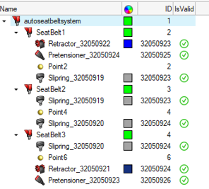 ) - Define a portion of the seatbelt system, with a belt path made of a list of control points and a mesh realization type. This entity also contains information about the components on which the belt elements are collected. The seatbelt segment provides options from its context menu to interactively modify the belt path or create solver cross-sections on the belt segment.