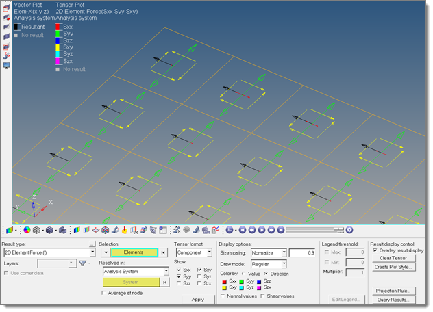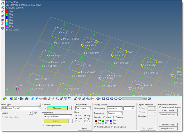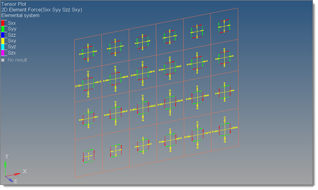 - Fx and Fy are the normal forces acting on the x and y faces of the 2D element below and are represented by the XX and YY components in the Regular drawing mode of the tensor plot in HyperView.