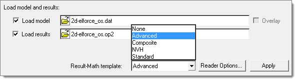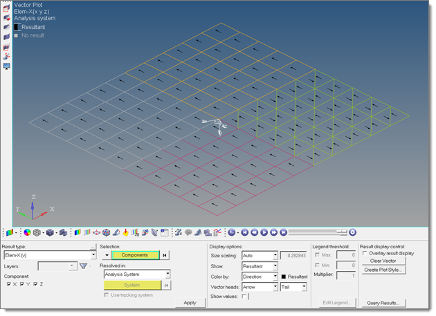 Load the model and results files with the Advanced Result-Math template in order to visualize the element x-axis in HyperView.