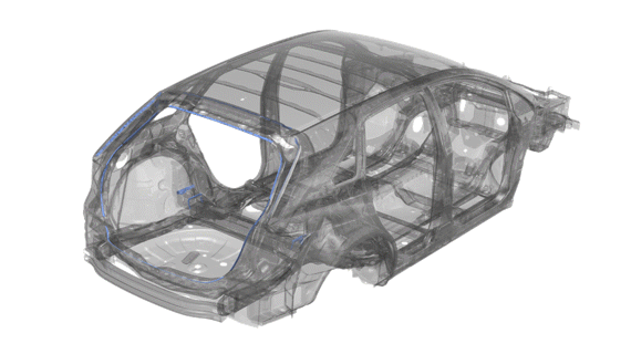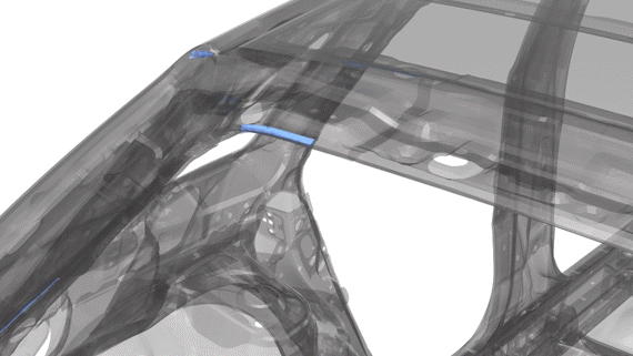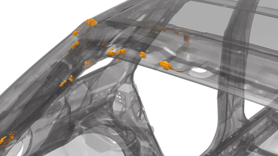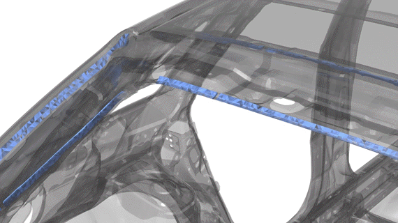 Figure 1 shows a sample automotive model with structural adhesives used to improve stiffness, but the adhesive length is not optimized. Figure 2 shows original adhesive being converted to an Adhesives design space using the process described on this page. Figure 3 and Figure 4 show structural adhesives before and after optimization respectively. The performance of the optimized model shows similar performance benefits, but it saves a significant quantity of adhesives.
